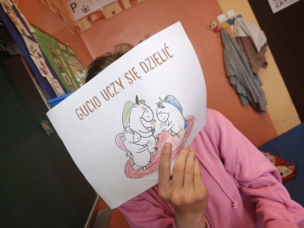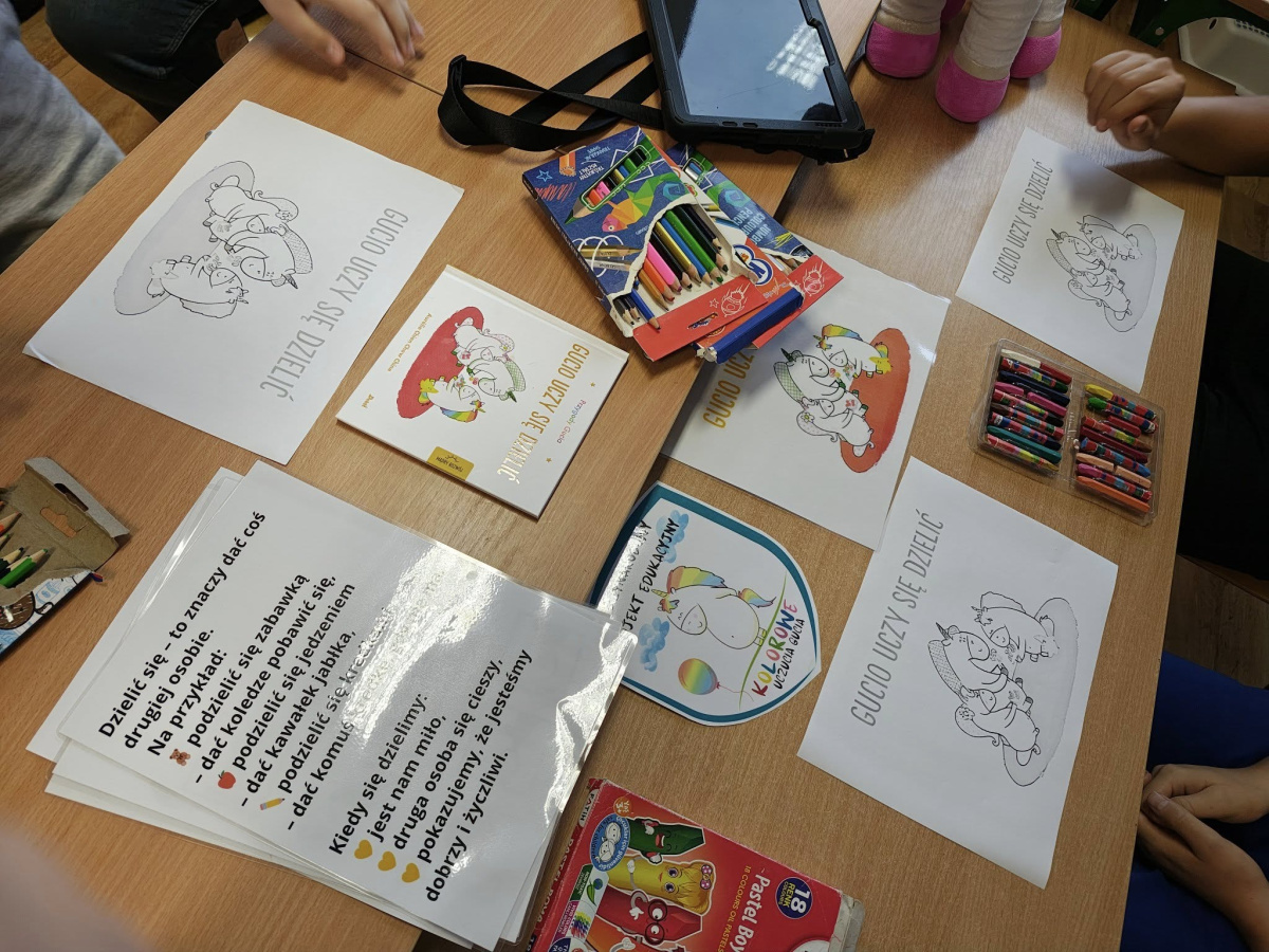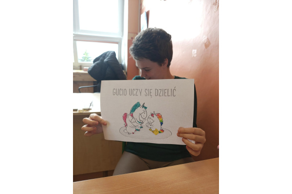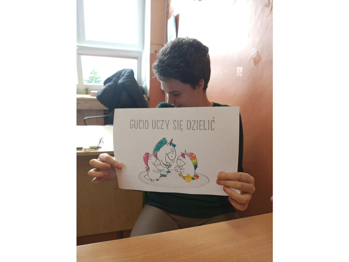 Uczniowie klas 3b, 7d i 6e w tym tygodniu poznali kolejną przygodę Gucia pt. „Gucio uczy się dzielić” w ramach Międzynarodowego Projektu "Kolorowe uczucia Gucia". Podczas zajęć uczniowie rozmawiali o tym, co oznacza dzielenie się i w jaki sposób można to robić na co dzień. Ćwiczyli używanie słów „proszę” i „dziękuję”. W rozmowach posługiwali się również komunikacją AAC. Na zakończenie uczniowie wykonali piękne malowanki-odwzorowanki, przedstawiające Gucia i jego przyjaciół, z którymi dzielił się swoimi rzeczami.