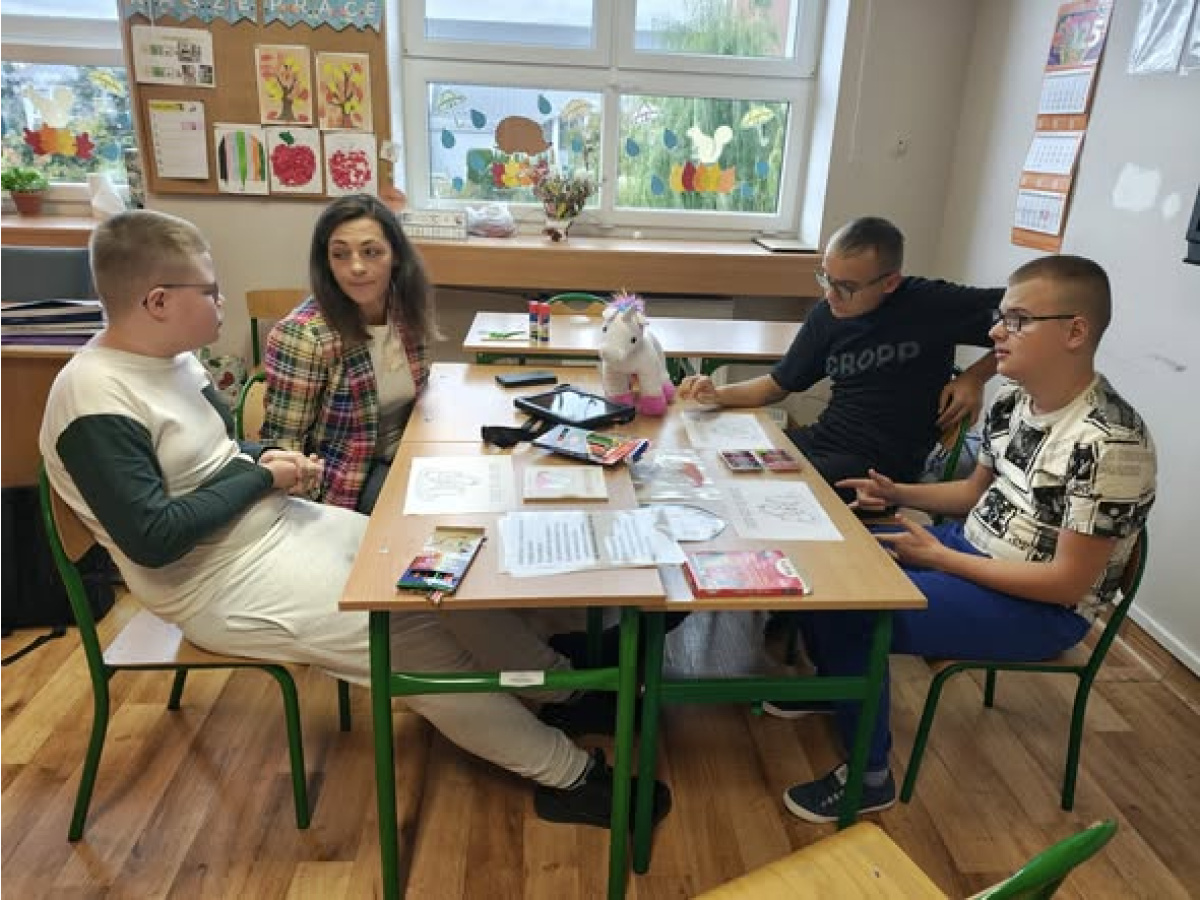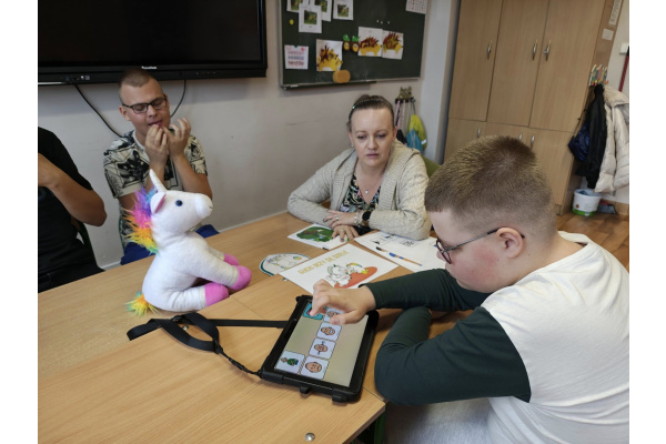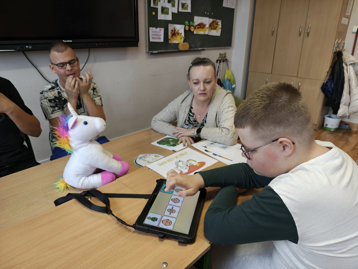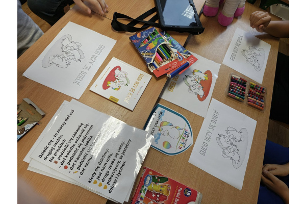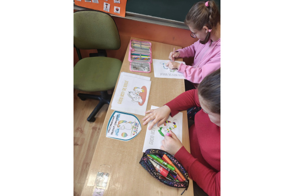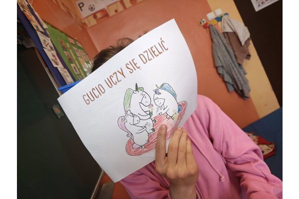 Uczniowie klas 3b, 7d i 6e w tym tygodniu poznali kolejną przygodę Gucia pt. „Gucio uczy się dzielić” w ramach Międzynarodowego Projektu "Kolorowe uczucia Gucia". Podczas zajęć uczniowie rozmawiali o tym, co oznacza dzielenie się i w jaki sposób można to robić na co dzień. Ćwiczyli używanie słów „proszę” i „dziękuję”. W rozmowach posługiwali się również komunikacją AAC. Na zakończenie uczniowie wykonali piękne malowanki-odwzorowanki, przedstawiające Gucia i jego przyjaciół, z którymi dzielił się swoimi rzeczami.