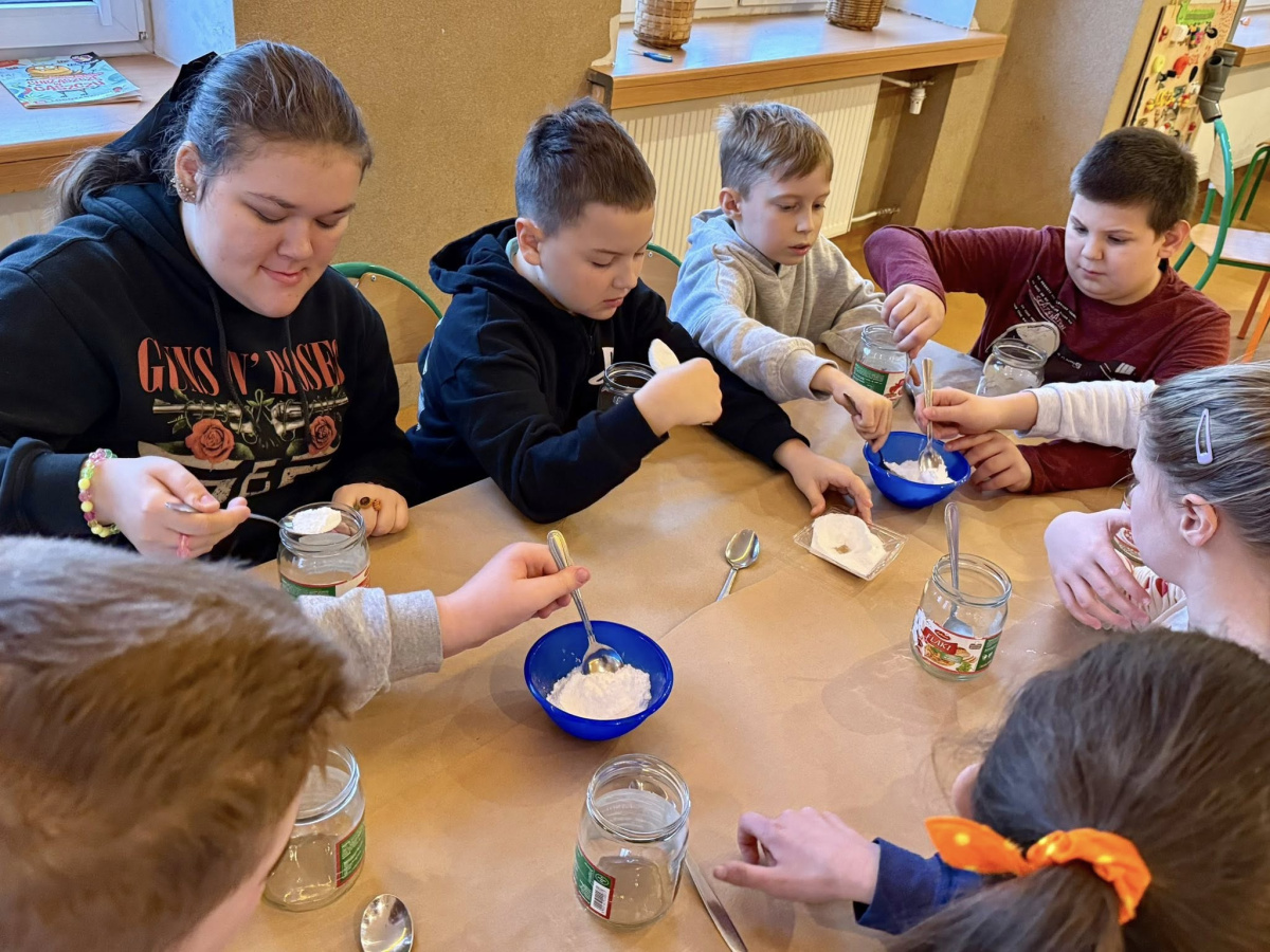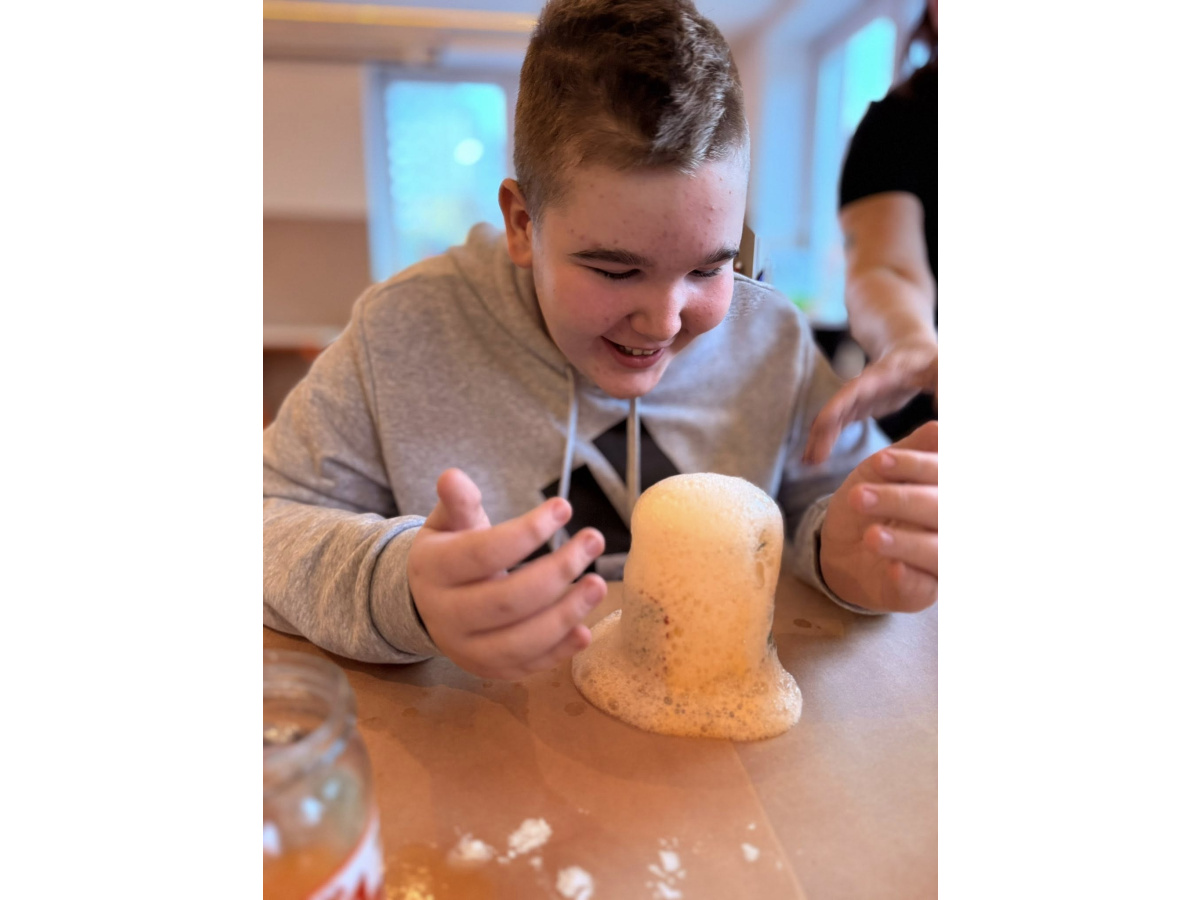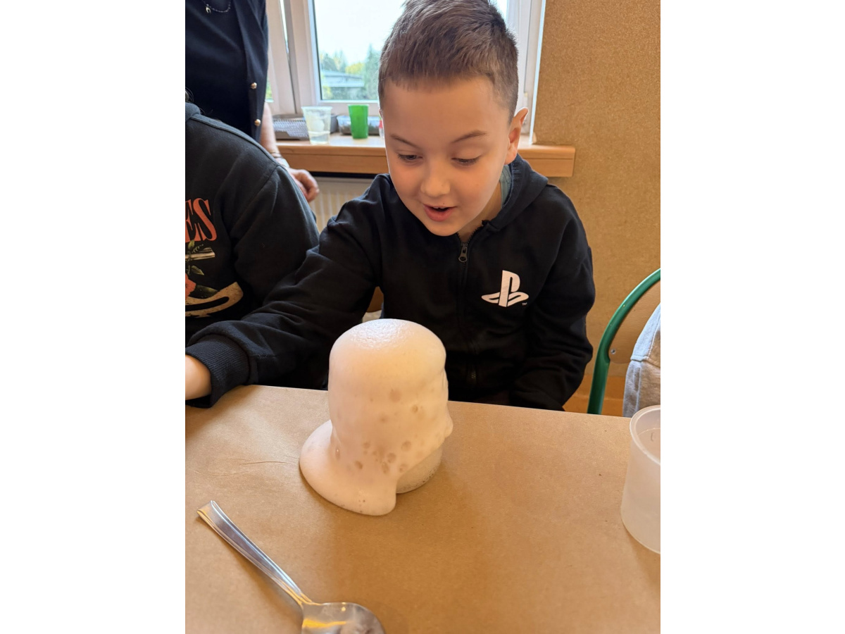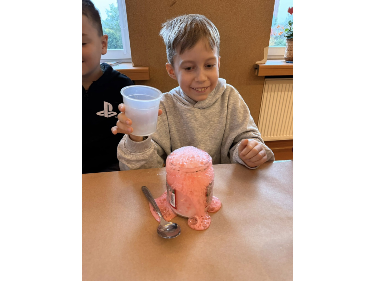 W ramach innowacji pt. „Świetlicowe laboratorium odkrywców” uczniowie wcielili się w małych naukowców i przeprowadzili eksperyment z użyciem sody oczyszczonej, octu i barwników spożywczych. W efekcie powstały prawdziwe kolorowe wulkany, które zaskakiwały wybuchami piany!